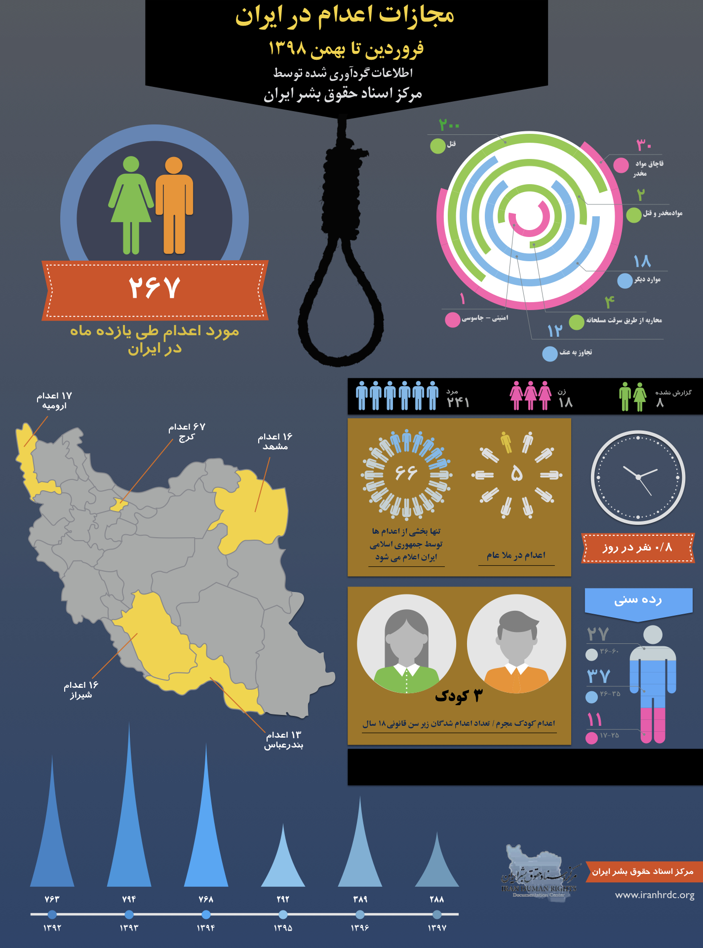داده نمای مرکز اسناد حقوق بشر ایران از وضعیت اعدام ها در ایران طی ۱۱ ماه نخست سال ۱۳۹۸