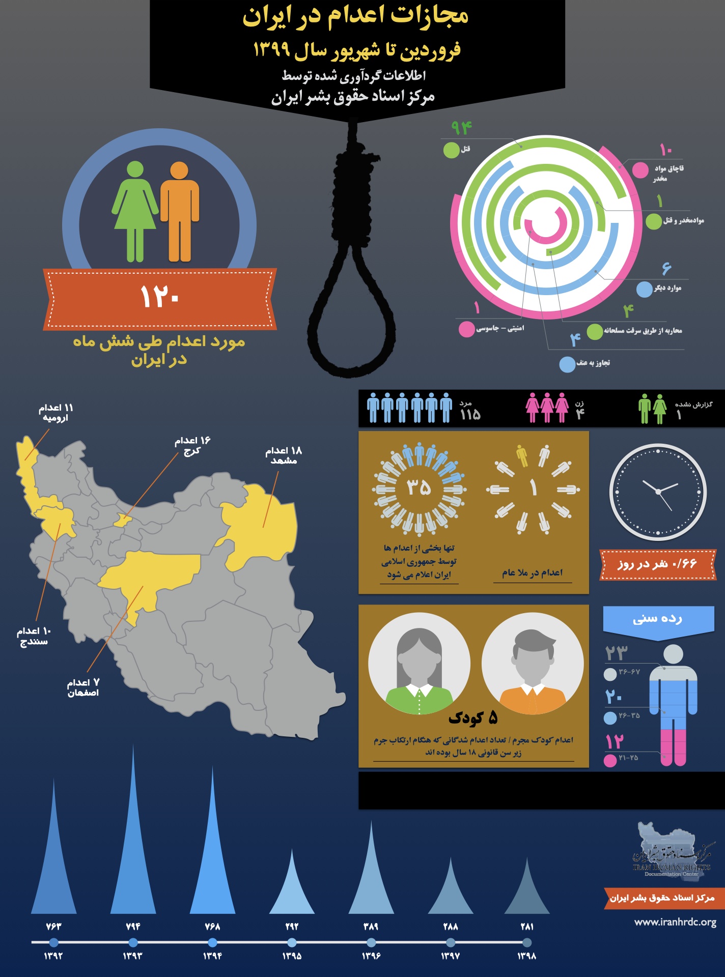 داده نمای مرکز اسناد حقوق بشر ایران از وضعیت اعدام ها در ایران طی ۶ ماه نخست سال ۱۳۹۹