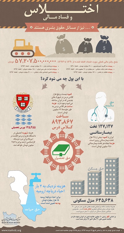 داده نما زیر با استفاده از رقم مجموع شش مورد اخیر فساد مالی در ایران در واقع برای نشان دادن آن است که اختلاس و فساد دولتی چگونه می تواند نمایانگر مسائل حقوق بشری باشد. حال که شرکتهای خارجی مشغول در نظر گرفتن کسب و کار با جمهوری اسلامی ایران شده اند، باید نهایت توجه شان به آن باشد که شیوه های فساد تقویت نشود.