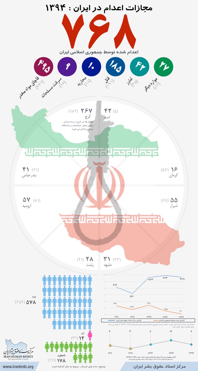 داده نمای ذیل٬ به جزئیاتی از جمله جرایم٬ جنسیت و پراکندگی اعدام ها در برخی زندان های اصلی کشور اشاره کرده است. تعداد اعدامی ها در ۸ شهر و ۱۰ زندان کشور و مقاسیه آن با آمار سال گذشته؛ نمایش سهم اعدام ها در جرایمی مانند قاچاق مواد مخدر و قتل با دیگر جرایم؛ بخشی از جزئیاتی است که بدان ها اشاره گردیده. از ۷۶۸ اعدام انجام شده در سال ۱۳۹۴ ، ۴۹۵ مورد آن به مربوط به قاچاق مواد مخدر و ۱۸۵مورد مربوط به قتل نفس بوده است.