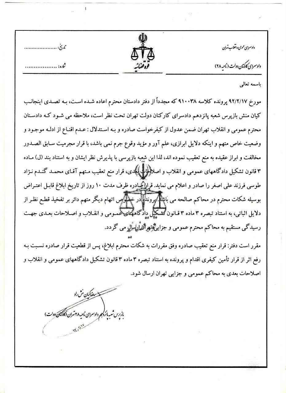 - قرار مجرمیت متهم در تاریخ ۹۱/۷/۲۲ به تأیید دادیار دادسرای تهران رسیده است.