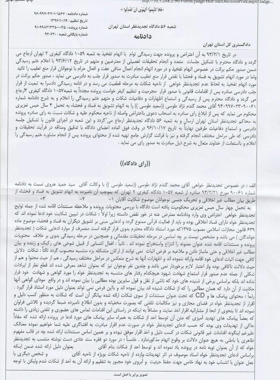 [۱۱۳] مدارک پروندۀ سعید طوسی، منتشر شده از سوی محمود صادقی، نمایندۀ تهران در مجلس، پیوست الف، سند ۹، دادنامه شعبه ۵۶ دادگاه تجدید نظر استان تهران.